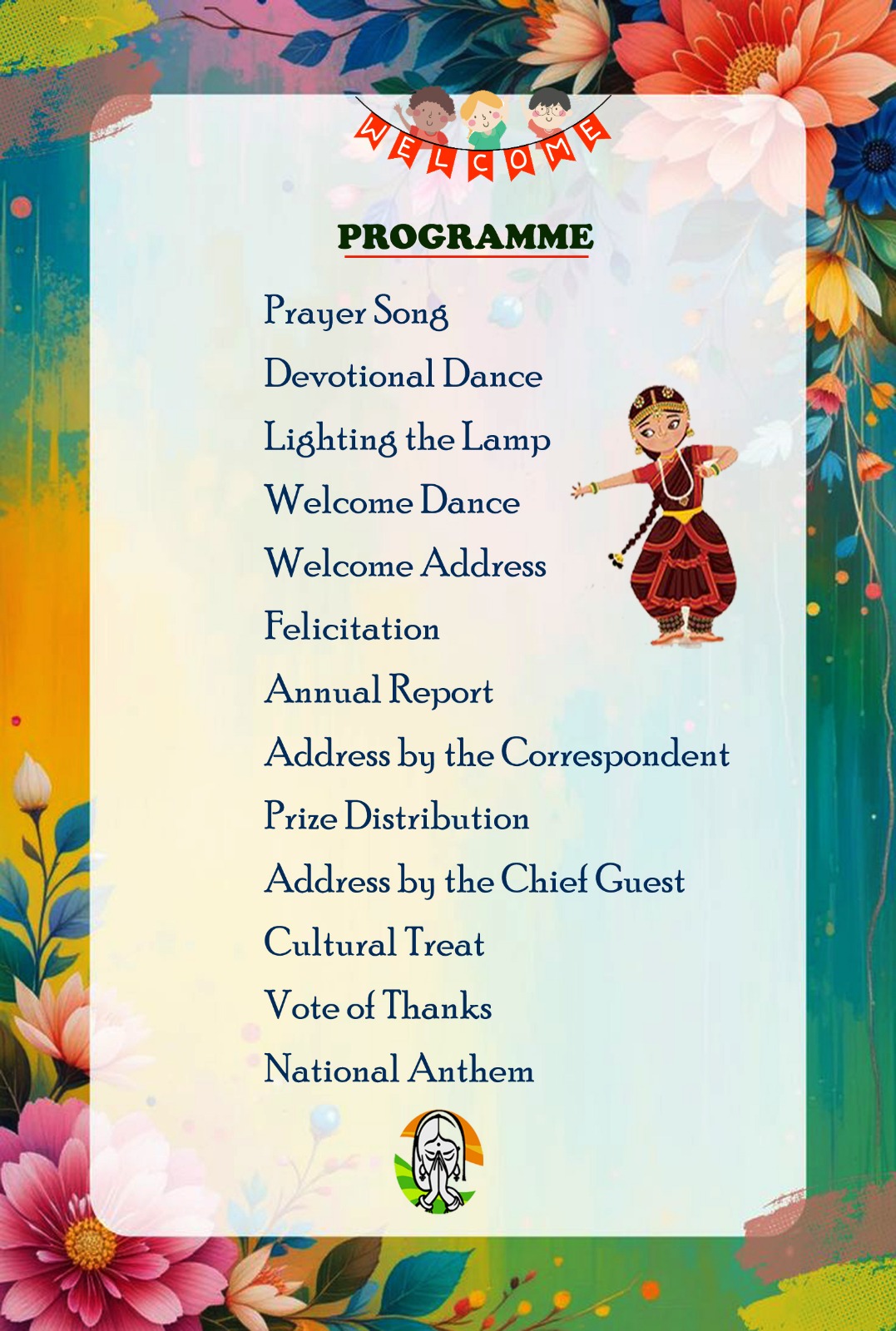 The celebration continues with a vibrant Welcome Dance and a Welcome Address, extending warm greetings to the esteemed guests, parents, and well-wishers. The programme also includes Felicitation of distinguished guests and the presentation of the Annual Report, reflecting the school’s accomplishments and progress during the year. This is followed by the Address by the Correspondent and the Prize Distribution, recognizing the hard work and achievements of the students.