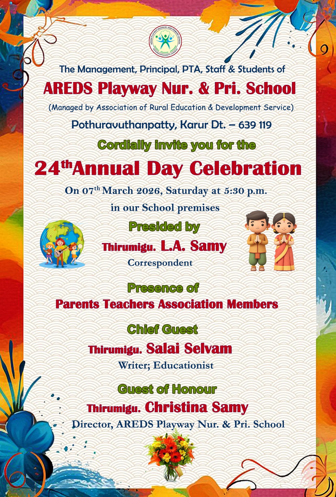 It is with immense joy and pride that we welcome you all to the 24th Annual Day Celebration of AREDS Playway School in Karur. This special occasion is a celebration of the journey, achievements, and talents of our students who continue to grow and shine under the guidance of dedicated teachers and the support of their families.